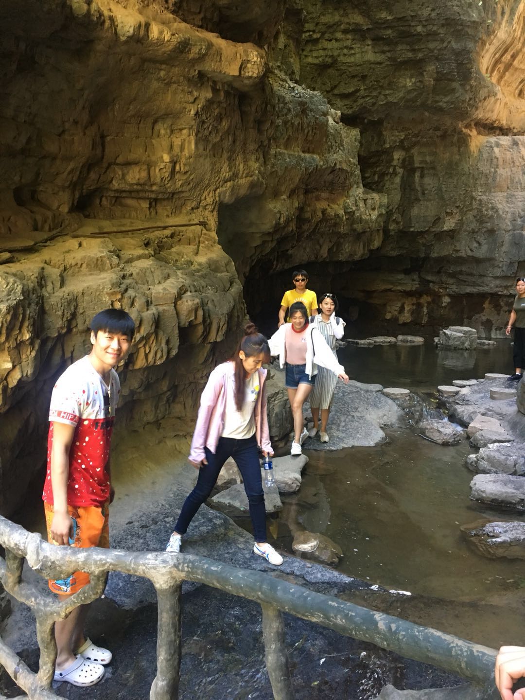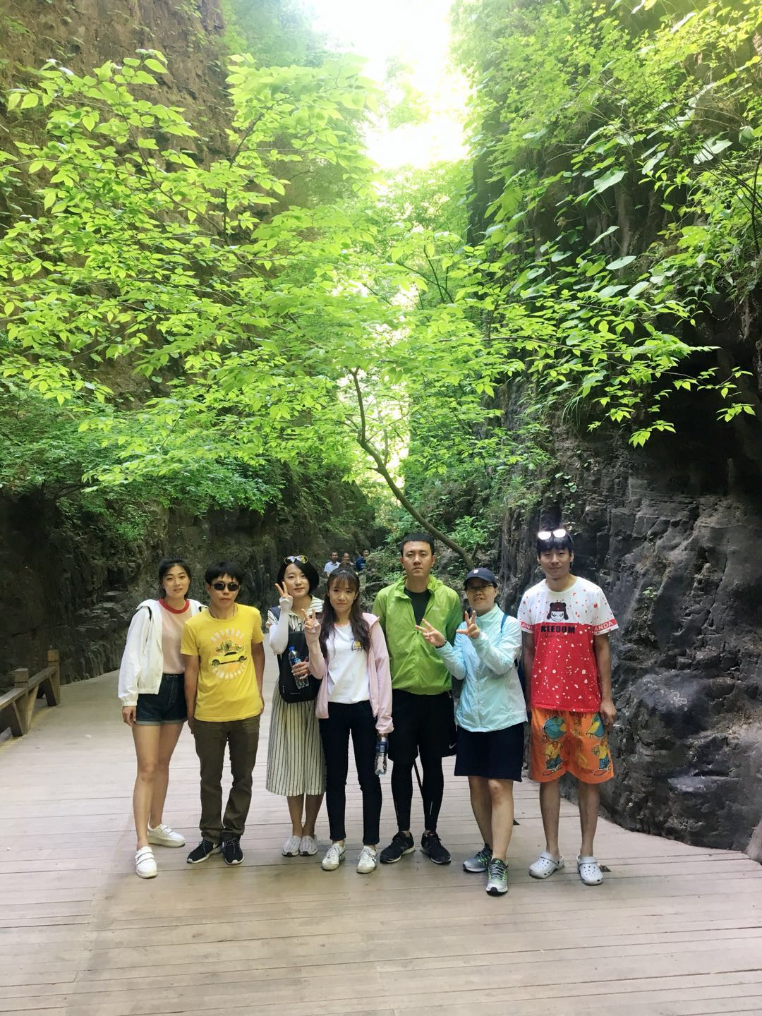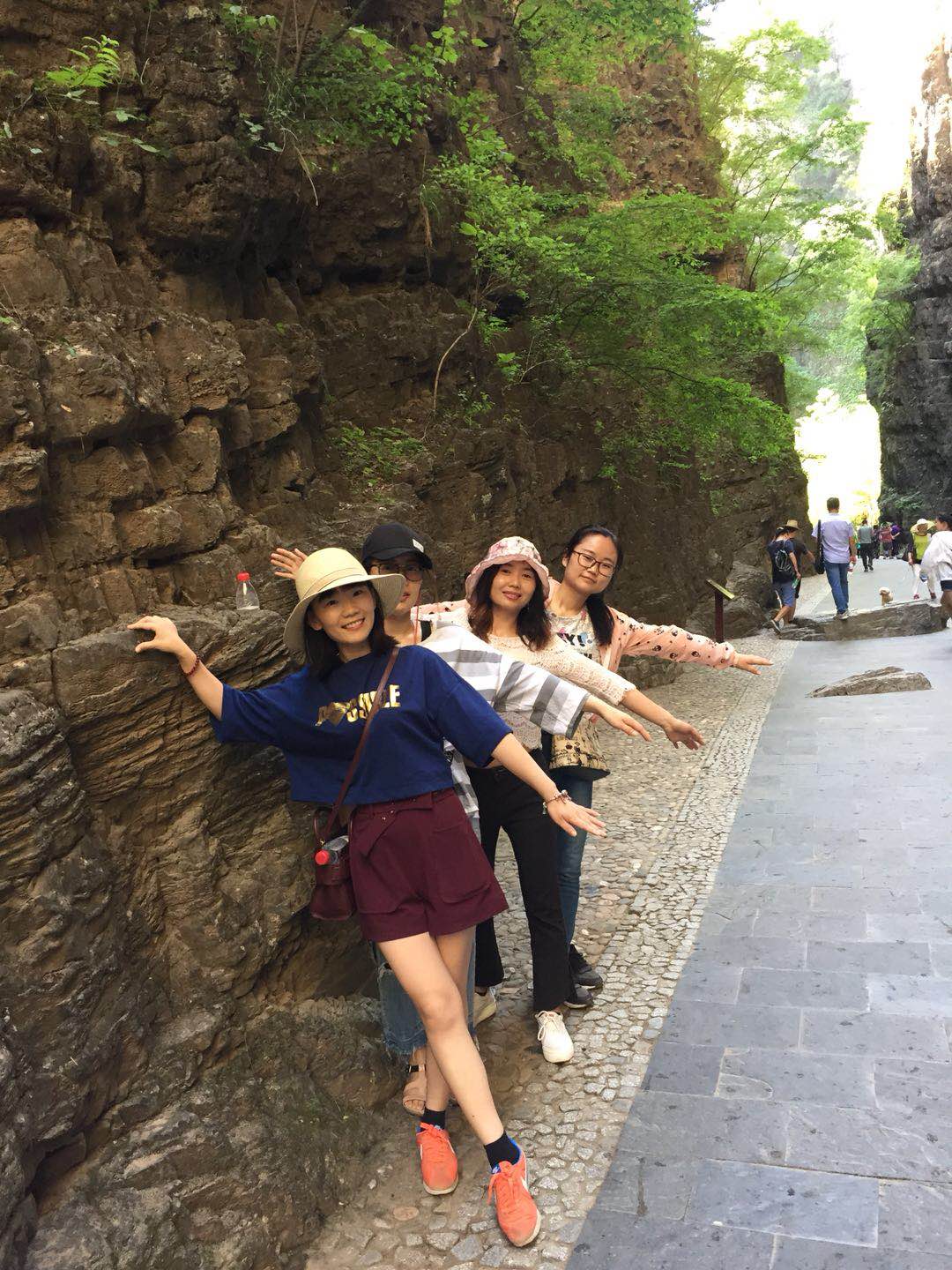 團建活動part 4:游覽“天下第一峽” 團建第二天我們要去到的是被譽為“天下第一峽”的百里峽景區,聽聞百里峽天梯有三千余階,可是嚇死“寶寶們”呢,幸好經過一夜的休息,大家精力已恢復大半。 走在狹窄的峽谷中,駐足而望,兩側聳然屹立的翠色絕壁,頭頂上若隱若現的一線天光,遠處山巔的藍天白云,腳下忽左忽右的溪流……若不是那彩色纜車過于美好,“小芯”肯定是要徒步登上山頂的!沒錯,“小芯”真的是被纜車“色誘”過去的!!!