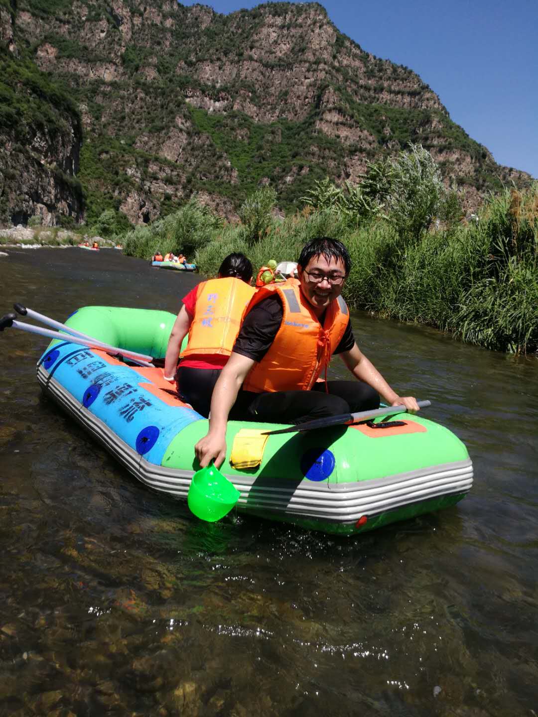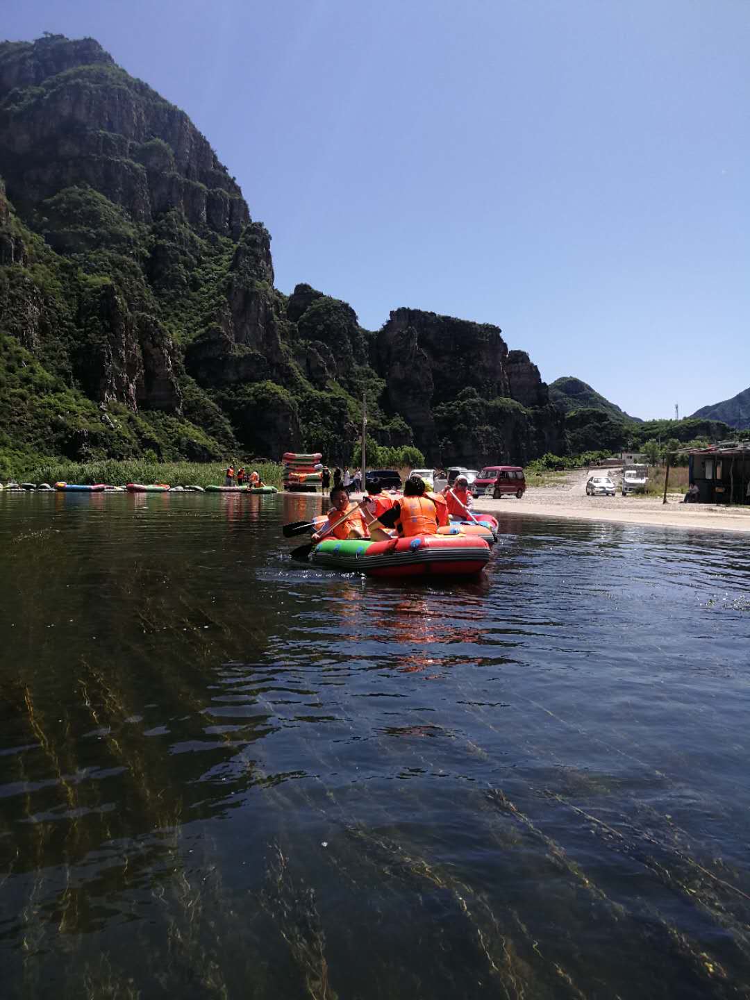 (漂流前合影) 集合完畢,大家紛紛領了裝備,穿上救生服,上了漂流船。 不得不說這里的景色著實讓人流連忘返,在這里,我們可以領略險峰絕壁,可見空中鸛鳥飛翔,河面鴛鴦戲水,水下魚蝦飛躍......嘩!不知何處的一瓢清泉澆滅了“小芯”的幻象,沒錯這些都是想象,實際情況是潑!!水!!節!!話不多說,上圖: